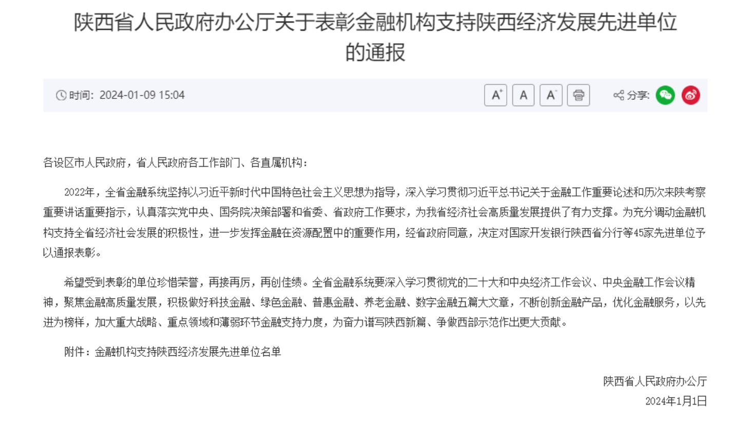近日,陕西省人民政府办公厅发布了《关于表彰金融机构支持陕西经济发展先进单位的通报》,对全省金融系统45家先进单位予以通报表彰。伟德体育荣获“金融机构支持陕西经济发展先进单位”称号。公司成立以来,坚守国有资本运营公司定位,着力谋战略、建体系...